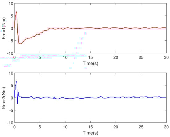 The simulation object adopts the two-degree-of-freedom (2-DOF) manipulator from []. In the parameters of the 2-DOF robot manipulator, for the first and second links, their lengths, masses, mass centers and inertia are expressed as and , and , and , and , respectively. In the initial rough parameters of the 2-DOF robot manipulator, for the first and second links, their lengths, masses, mass centers and inertia are expressed as and , and and , and , and , respectively. The specific values are shown in Table 1 and Table 2.