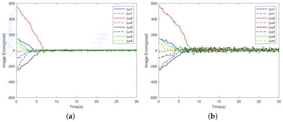 The Cartesian coordinates of Feture Point 1 to Feture Point 4 that relative to the robot base are m, m, m, and m, respectively. The initial 2D coordinates of the image feature points are pixels, pixels, pixels, and pixels. The desired 2D coordinates of the image-feature points are pixels, pixels, pixels, and pixels. The initial states of robot manipulator are chosen as , . The coordinate transformation matrix of the end-effector framework relative to the camera framework is expressed as