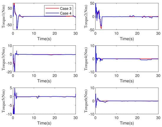 Torque of the 6-DOF robot manipulator with time-varying external disturbances in Case 3 and Case 4.