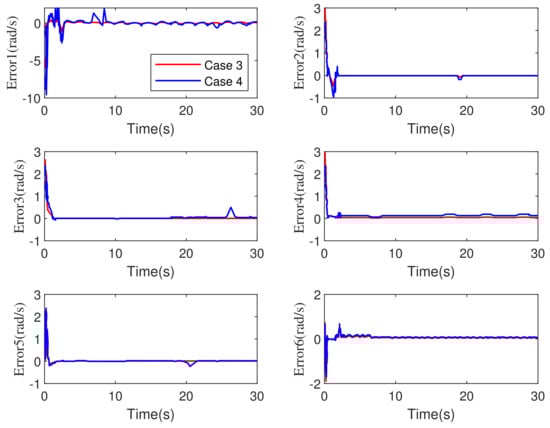 Velocity estimation errors with time-varying external disturbances in Case 3 and Case 4 for the 6-DOF robot manipulator.