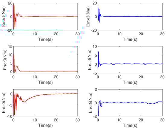 With an aim of comparing the control effects of several methods, the same initial positions of the image features are set, which are represented by circles in Figure 4, and the same desired positions of the image features are represented by boxes. Figure 4 displays the trajectories of features in the image plane in Case 1, 2, and 3 control strategies, respectively. The trajectories of Feture Point 1 to Feture Point 4 are shown in red, green, blue and black, respectively. In Case 1, the rough initial parameters make the classical image-based visual servoing invalid, the feature points deviate from the desired positions, and the visual servoing task cannot be completed. In Case 2 and 3, the image features both reach the desired final position. However, the trajectory of image features fluctuates during the convergence process in Case 2. In Case 3, the trajectory of image features converges to the desired position smoothly and quickly. Figure 4c indicates that the proposed method can obtain satisfactory control effects without joint-angle measurement in the company of visibility constraints, actuator constraints, and system model uncertainty. Figure 5 displays the feature response deviations in the image plane in Case 1, 2, and 3 control strategies, respectively. The deviation is defined as the difference between the current feature point coordinates and the desired point coordinates. In Figure 5b,c, it can be seen that the stabilization time of the control system is about 10 s in Case 3, faster than in Case 2 (15 s). In Figure 6, it can be observed that the traditional SMO control strategy leads to the chattering phenomenon of the joint torques, while the proposed MPC-TOSM method can suppress the chattering phenomenon effectively and better complete the visual servo goals. Figure 7 and Figure 8 display the estimation errors of the joint velocities together and the uncertainty estimation errors of the observers in Case 2 and Case 3. We can see that the TOSM observer has higher estimation accuracy than the traditional sliding mode observer. Higher estimation accuracy brings better control performance to the control system.