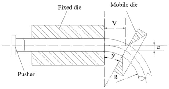 The principle of spatial variable curvature bending forming is shown in Figure 1. This process consists of a fixed die, a mobile die, and a pusher [27,28]. The fixed die acts as a fixed pipe and guide. The mobile die can move and rotate in space and is the main part of this machine. The role of the pusher is feeding pipe. Each parameter is presented in Figure 1 and Table 1. The relationship among parameters is as seen in Equation (1). By this equation, it is found that the bending radius of the pipe is related to and (detailed explanations of these parameters are given in Table 1). The rotation angle of mobile die is only for the purpose that the thrust of the mobile die to the pipe is perpendicular to the pipe.
