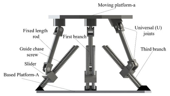 The 3PUU moving part proposed in this article has three parallel branched chains which are asymmetrically distributed in space. Each connecting chain is composed of prismatic (P), lower universal, and upper universal joints arranged from the base to the output link. In the first two branches, the axis of the first revolute joint of lower universal (U) joints is perpendicular to the based platform-A, whereas the axis of the second revolute joints of the upper U joint is perpendicular to the moving platform-a. In the third branch, the axis of the first revolute joint of the lower U joint is parallel to the based platform-A, and the axis of the second revolute joints of upper U joint is parallel to the moving platform-a, as is shown in Figure 3.