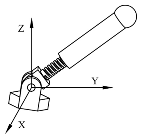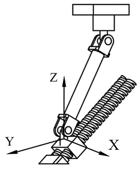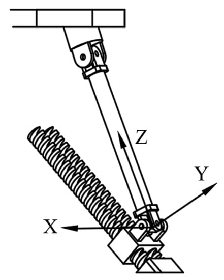 The 3RPS rotary part has three parallel branched chains which are symmetrically distributed in space, as shown in Figure 4. Each connecting chain is composed of revolute (R), prismatic (P), and spherical (S) joints. For the first branched chain, the coordinate system is established (Figure 7). The origin is the first kinematic pair. The -axis is along the axis of this revolute (R) joint, and the -axis is perpendicular to the based plane. Thus, the screw system of branch chain can be written as follows: