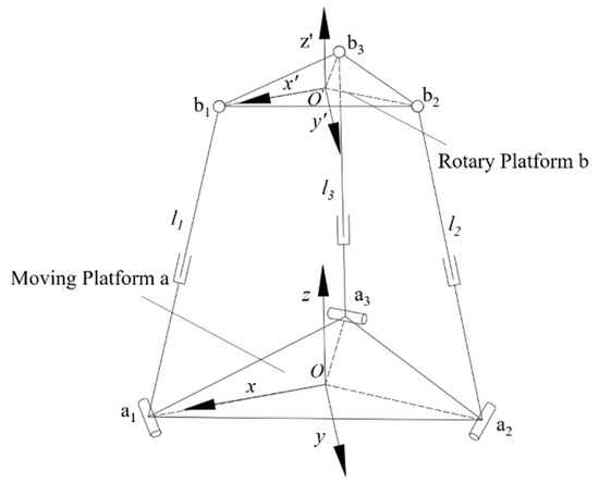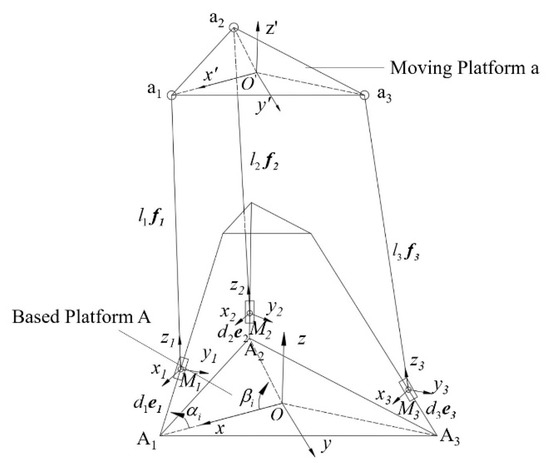where , , and represent the moving distances of the platform a relative to the based platform-A along three directions of the -axis, -axis, and -axis, respectively.