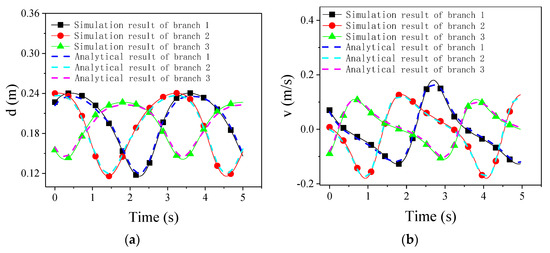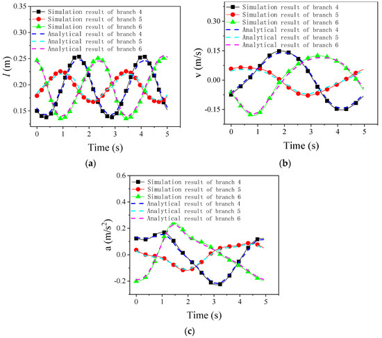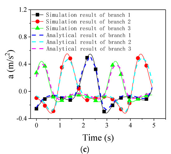 Taking the fixed coordinate system as the reference system, the motion parameters of the moving platform-a of the 3UPU parallel mechanism can be shown as Equation (50), and the motion parameters of the rotary platform-b of the 3RPS parallel mechanism is as Equation (51). Figure 10 and Figure 11 compare the simulation results with analysis results by the displacement curve, velocity curve, and acceleration curve of each branched chain. The analysis model was validated by the comparison of the simulation results with the calculation results.