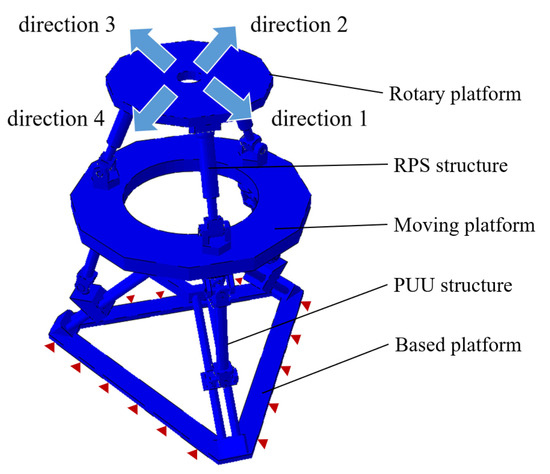 In this section, finite element simulation software ABAQUS (Paris, France) is used to analyze the stiffness of the whole structure and its branch chains. The geometric models were created and assembled in Solidworks, and then imported into ABAQUS. The FE model is shown in Figure 12 which includes the based platform, moving platform, rotary platform, PUU structure, and RPS structure. The based platform, moving platform, and rotary platform were defined as rigid bodies. The PUU and RPS structures were defined as deformable bodies which were given the material properties of tool steel Cr12Mo1V1, and its specific parameters are given in Table 3. These deformable bodies were meshed by using C3D4 solid elements which were four-node linear tetrahedron elements, and the minimum element size was 1 mm. The interaction was set to general contact, where the slider in the 3PUU structure was tied to the lead screw on the based platform. Because moving parts of the structure are lubricated in practice, the coefficient of friction was identified as 0.1. The analysis step was identified as static general. In addition, the base platform was completely fixed, the mobility and rotation degrees of the 3PUU and 3RPS branch chains were preserved. Through the bending test of an aluminum alloy tube with diameter of 30 mm and wall thickness of 2 mm by using a universal testing machine, it is found that the bending force of the tube is 5 kN [29]. In order to verify the stability and rationality of the designed mechanism, 15 kN force was used to simulate the mechanism. So a static load of 15 kN was applied to the center of the rotary platform-b along four directions as shown in Figure 13. The stress distribution is also shown in Figure 13. The static analysis of each branch chain was also carried out. In addition, the static loads of 8 kN were applied, and the stress distribution was as shown in Figure 14.