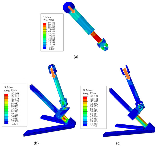 Stress distribution of branch chain. (a) Stress distribution of branch chain RPS; (b) stress distribution of PUU branch chain-1; (c) stress distribution of PUU branch chain-2.