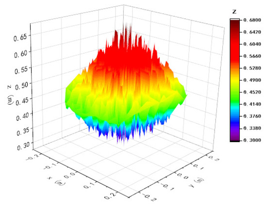For the 3PUU moving part, the maximum rotary angle of U joints is , and the maximum translational distance of the slider is m. For the 3RPS rotary part, the maximum rotary angle of spherical (S) joints is , the maximum translational distance of slider is m. Through the polar coordinate searching method, the workplace of this 3PUU-3RPS mobile die is calculated by using MATLAB and is shown in Figure 15. It is found that the range of the mechanism is 0.3 m in the Z direction, and the range of motion in the X and Y directions is ±0.2 m. Currently, the extreme structure of bending tubes is characterized by small bending radii (Rd/D < 3) [31]. According to the results of the previous FE simulation results by Equation (1), it is found that the bending die needs to move 55 mm when the minimum bending radii is 90 mm [32]. Therefore, Equation (1) describes the motion of tube bending that can be performed within the workspace presented in Figure 15.
