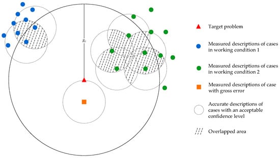 As shown in Figure 2, the retrieved cases are not uniformly distributed in the whole space. Moreover, the accurate descriptions of historical cases are uncertain due to the existence of measuring error. In this paper, the measuring error is assumed to follow the Gaussian distribution. With a certain confidence level, accurate descriptions of historical cases lie in dashed circles centered in their corresponding measured descriptions. Since the similarity is usually calculated according to the measured descriptions, cases with the highest similarity are not necessarily the most helpful cases for the target problem. However, there exist some overlaps in the area with high-density cases, showing cases in the high-density area have higher reliability than other cases since the accurate descriptions are more likely to lie in the overlaps. Therefore, although cases in the low-density area may have a higher similarity to the target problem, they should not proceed to the case reuse step due to their lower reliability.