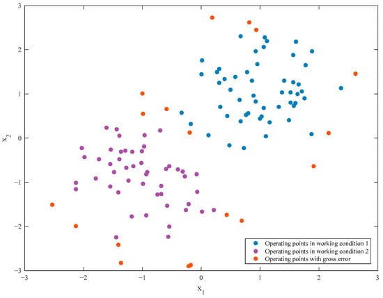 In this numerical simulation, 120 operating points were generated with MATLAB 2019A to simulate the characteristics of multiple working conditions and measurement error of industrial data. Particularly, two working conditions were generated with different centers and deviations (the deviations followed Gaussian distribution to simulate the measurement error in industry). In detail, every working condition consisted of 60 operating points, and the centers of working condition 1 and working condition 2 were set as (1, 1) and (−1, −1), respectively. In addition, standard deviations of the two working conditions were both set as 0.5. It should be noted that the operating points with larger deviation from their corresponding centers were considered as operating points with gross error, and they should be removed before the case reuse. Figure 3 shows the distribution of the generated dataset, which can perfectly reflect the characteristics of industrial data.