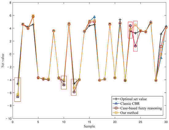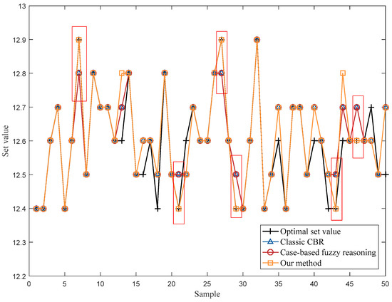 As shown in Figure 6, CBR with the designed abnormal case removal method (our method) can obtain better results in the operational optimization of moisture content of leaf-silk drying machine in production line A. In particular, overall, there are six operating points (marked with red boxes) in which our method outperformed the classic CBR and case-based fuzzy reasoning. This is due to some abnormal cases being removed by the proposed case removal method in the case retrieval step. Furthermore, the influence of multiple working conditions was not considered in the case-based fuzzy reasoning, and thus the performance of CBR with the designed abnormal case removal method was better. In summary, the MAE of classic CBR in testing dataset was 0.034 and the MAE of case-based fuzzy reasoning was 0.03, while the MAE of our method in the testing dataset was 0.026. The proposed abnormal case removal method improved the MAE by 23.5% compared to classic CBR, and by 13.3% compared to case-based fuzzy reasoning. Therefore, the effectiveness and the superiority of the local density-based abnormal case removal method was proven, and it is suitable for the operational optimization of industrial processes.