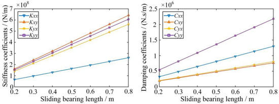 The studied sliding bearing is described in Figure 5, and the nominal values of its structural parameters are Lb = 0.45 m, φ = 0.002, λ = 2.04 and η = 0.0016 Pa·s. The nominal values were first used to calculate the stiffness and damping coefficients of the sliding bearing according to the method provided in Section 2.1, and the dynamic characteristic coefficients computed through the programs in the MATLAB virtual environment are provided in Table 1.