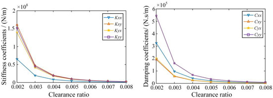 Variation tendencies of the dynamic coefficients for different clearance ratios φ.