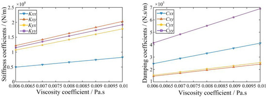 Furthermore, the structural parameters containing the length Lb, clearance ratio φ, ratio of length to diameter λ and oil film viscosity coefficient η were taken as the variables, and the effects of the variations of the structural parameters on the dynamic characteristic coefficients of the sliding bearing were studied following the single variable principle. In Figure 6, the stiffness and damping coefficients of the sliding bearing increase with the increase of the length Lb. In Figure 7, the stiffness and damping coefficients of the sliding bearing decrease with the increase of the clearance ratio φ. In Figure 8, the stiffness and damping coefficients of the sliding bearing increase with the increase of the ratio of the length to diameter λ. In Figure 9, the stiffness and damping coefficients of the sliding bearing increase with the increase of the viscosity coefficient η. Therefore, it is significant to take the uncertain sliding bearing structural parameters into consideration, since their variations can lead to the changes of the dynamic characteristic coefficients.