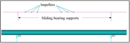 On the basis, a schematic diagram is provided in Figure 3 to describe the equivalent approach for the multi-stage centrifugal pump rotor system. In Figure 3, the red points mean the Mass 21 units which are used to represent the impellers at these positions, and the COMBI214 spring-damping elements represent the dynamic characteristics of the sliding bearings.