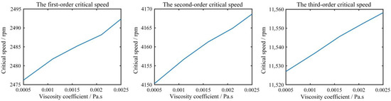 Influences of the viscosity coefficient η on the first three critical speeds.