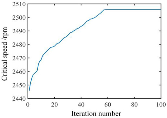 To carry out the improved particle swarm optimization algorithm for solving the established optimization models, the number of particles was 80, the maximum number of iterations was 150, the learning factors C1 and C2 were defined as 1.5, respectively, and the maximum and minimum inertia weights were 1.2 and 0.6, respectively. During the optimization process, the MATLAB and ANSYS were combined to calculate the critical speed of each particle. The iterative process for obtaining the maximum value of the first-order critical speed is shown in Figure 15, where the optimal critical speed trends to a stable value after 58 iterative calculations. The finally obtained extreme values of the first three critical speeds are listed in Table 4, and obvious differences between the maximum and minimum values can be observed. Comparing the extreme values in Table 4, the deviations of the first three critical speeds are 54.4 rpm, 39.7 rpm and 13.8 rpm respectively, and the corresponding variation rates are 2.22 %, 1.0% and 0.12%. Thus, the first-order critical speed shows more vulnerable to the variations of the sliding bearing structural parameters.
