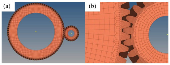 (a) Model after meshing (b) mesh elements at the meshing of the gear teeth.