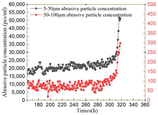 Variation trend of abrasive particle concentration (a) 5–50 μm abrasive particle concentration; (b) 50–100 μm abrasive particle concentration.