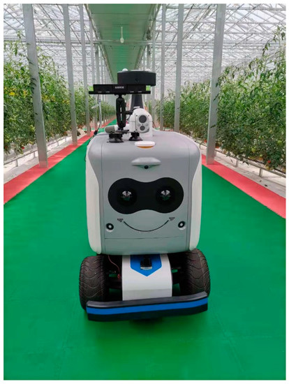 As shown in Figure 1, the collection of the experimental samples and the model effect test in this paper were all carried out in the National Vegetable Quality Standard Center (Shouguang, Shandong) Science and Technology Demonstration and Promotion Base. We set up the experiment in the greenhouse to ensure the engineering applicability of the algorithm. For the plant growth state data, the camera mounted on the inspection robot is used to obtain it. The inspection robot uses QR code navigation to conduct inspections through preset routes, as shown in Figure 2.