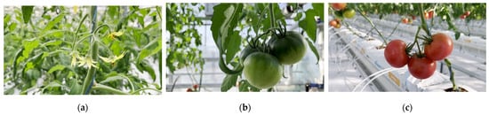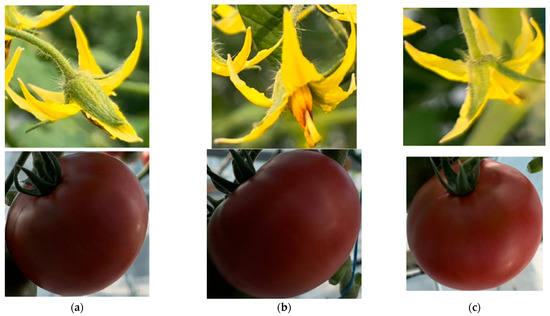 Figure 3. Images in the dataset used for object detection model training and testing: (a) tomato flower; (b) unripe tomatoes; (c) unripe tomatoes.