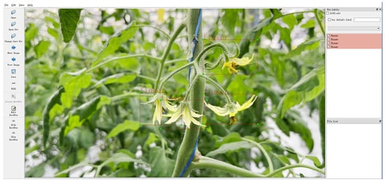For video stream data, we intercept the images from the video stream every 10 fps to obtain images for training and testing of the object detection model. In this study, we divided the dataset into the training set and test set according to the ratio of 10:1, with 1000 training images and 100 testing images. As shown in Figure 3, we divide the targets into three categories: flower, tomato red, and tomato green, according to the needs of the actual production process. When we conducted a feasibility analysis at the beginning of the study, we found that the network had a low detection ability for tomato flowers and green tomatoes. Taking YOLOv5 s as an example, when the number of three types of targets in the training set is about 600, the mAP (0.95) of tomato flower, green tomato, and red tomato is 60.4%, 87.6%, and 94.3%, respectively. So, it is difficult for the network to distinguish the two types of objects of tomato flower and green tomato from the background in complex environments. Therefore, to improve the network’s high and balanced accuracy for these three objects, we artificially increase the number of tomato flowers and green tomatoes. The number of targets for each category is shown in Table 1.