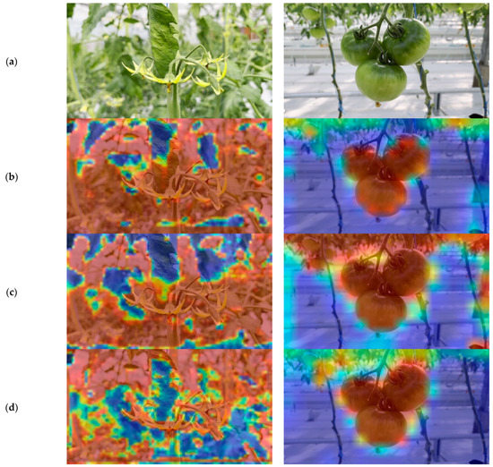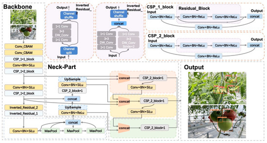 With the development of computer vision technology, target detection algorithms based on traditional methods have been widely used in yield estimation and crop growth period recognition. For instance, Using L*a*b* color space to perform K-means clustering segmentation of tomatoes and using mathematical morphology to denoise tomato overlap and occlusion to identify ripe tomatoes [3]. Liu G et al. use a support vector machine (SVM) [4] with a histogram of oriented gradients (HOG). Then, a color analysis method was used to remove false positives to improve detection accuracy [5]. Amarante M A et al. divide tomatoes into six ripening stages: Breaker, Turning, Pink, Light Red, and Red. The color of a tomato can be represented through different color spaces. They focused on converting the picture of the tomato in RGB color space to L*a*b* color space and determined the ripening stages and nutritional content of tomatoes using a color space conversion algorithm [6]. However, the feature extraction ability of traditional object detection methods is minimal, leading to poor robustness of the model. The identification and detection accuracy of tomatoes cannot meet the actual needs of current agricultural development.