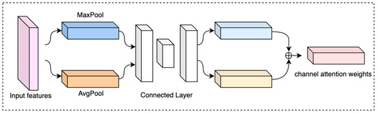 First, the CBAM attention mechanism performs global average pooling and global max pooling on the feature map, the processed output feature matrix sizes are (1 × 1 × channels) and (1 × 1 × channels), respectively. Then, the two groups of channel weights are combined after passing through the fully connected layer, and then the weights in the channel dimension are obtained through the non-linear activation layer [23], as shown in Figure 8.