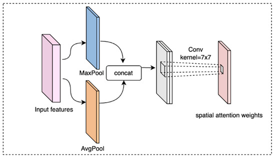 Secondly, the feature matrix obtained after the input feature matrix is weighted by the channels, as mentioned above, also uses global pooling and average pooling to process the channel dimension of the feature matrix. The resulting output feature matrix shapes are (h × w × 1) (h × w × 1). Finally, through the convolution layer with a kernel size of 7, the output feature matrix of size (h × w × 1) is obtained through the convolution and non-linear activation layer processing, as shown in Figure 9.