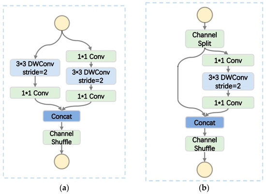 Shufflenetv2 is a lightweight model based on principles of efficient CNN network design. To improve the defects of shufflenetV1 [37], shufflenetV2 introduces a new operation called channel split [23]. Figure 10a shows that the input feature map will be equally divided into two branches in the channel dimension. The left branch is equally mapped, the right branch contains three convolutions, and the input and output channels are the same. The two branches are spliced together after completing the operations, respectively. The network uses a channel shuffle to reorganize the spliced output to ensure the information exchange between the two branches above. As shown in Figure 10b, there is no additional channel split for the down sampling module, but each branch directly copies an input, and each branch has down sampling with a stride is 2. Finally, after stitching these two branches together, the feature map space size is halved, and the number of channels is doubled.