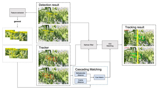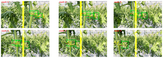 This study proposes a target tracking network for identifying and counting tomatoes at different growth stages called YOLO-deepsort. YOLO-deepsort is composed of a target detection network and a target tracking network. Based on the advanced YOLOv5s model, the detection part of YOLO-deepsort has better real-time performance and higher accuracy than the previous target detection algorithm, which could detect targets in different growth stages of tomatoes in complex agricultural scenarios with few parameters. Not only that, while improving the model detection ability, we also compress the model from the algorithm level, reducing the weights of the model. After the detection is completed, the SORT part of the network is responsible for processing the video stream data, tracking the target by building the connection between different video frames and defining an ID for each object in the video to achieve the count [29,30].