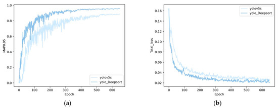 Figure 13. (a) The average mean precision of YOLOv5 s and YOLO-deepsort on the train set; (b) the total loss curve of YOLOv5 s and YOLO-deepsort on the train set.