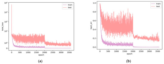 Figure 14. (a) The loss curve of the training and testing process on the test set; (b) the top1_err of training and testing process on the test set.