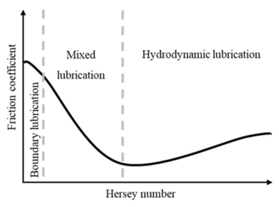 The Stribeck curve is a graph of the friction coefficients according to the Hersey number []. The Hersey number is a dimensionless number of rotational velocity, external force, and viscosity of the lubricant. It divides the frictional properties of a rotor and bearing system into three lubricating regions of hydrodynamic, mixed, and boundary lubrications. Figure 1 is an example of the Stribeck curve, and the three lubricating regions can be identified as the boundary lubrication with solid and solid contact, mixed lubrication with solid and fluid contact, and hydrodynamic lubrication supported only by lubricants. Based on the interval in which the friction coefficient of the derived graph changes rapidly, the lubricating regions can be distinguished, and the rotation speed and external force in each lubricating region can be determined. A method of analyzing this friction characteristic is an important technique to predict the degree of wear generated by a rotating machine [,,]. Since abrasion caused by friction during the steady state operation is fatal to the lifespan of the rotating device, predicting friction characteristics of a rotor and bearing system has been steadily required in the field of tribology.