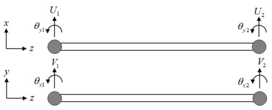 Shaft dynamics in a SC can be determined by solving the equation of motion including external, hydrodynamic, and contact forces. The rotating shaft is modeled as a Timoshenko beam without including rotary inertia and gyroscopic effects because they are not significant in the model of this paper, and the FEM is applied to the Timoshenko beam with the consideration of bending in the xz and yz axes. Figure 3 shows the coordinates of a beam element in xz and yz planes. The displacement vector and local mass and stiffness matrices for one beam element with two nodes can be represented as follows []: