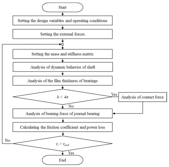 The proposed method is to calculate the frictional coefficients according to the rotational velocity to derive the Stribeck curve. Figure 4 is a flow chart to explain how to derive the frictional coefficients. First, we set the design variables, operating conditions of the analysis model, and external forces. Then, the behavior of the shaft is calculated to determine the oil film thickness corresponding to the time step, and the oil film reaction and contact force are calculated at that time. Using these calculated forces, the friction coefficient and power loss are calculated with the method explained in Section 2.