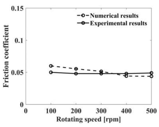 To verify the proposed method in this research, we compared the calculated friction coefficients with the measured friction coefficients of journal bearings conducted by X. Lu et al. []. In the reference paper, an experimental device was constructed to measure the frictional coefficients of journal bearings according to various lubricants and two types of bearing materials. The journal bearing used in the experiment has a bearing length of 0.0254 m, a bearing radius of 0.012355 m, a clearance of 85 μm, shaft and bearing average asperity heights (Ra) of 0.32 μm, and an external force of 667 N is applied to the -x direction. Figure 5 shows the measured and calculated friction coefficients according to the rotating speed. It shows that the largest measured and calculated friction coefficients occur at 100 rpm. According to the numerical results, contact occurred in all rotational speed conditions. As the rotating speed increased, the friction coefficient was decreased due to increased bearing force. The maximum error between measured and calculated friction coefficients is about 20% at 100 rpm. At rotational speeds above 200 rpm, the error is less than 10%. In the experiment, the viscosity changes according to the operating speed because the temperature of the lubricant changes at each rotating speed. However, in our simulation, we used one nominal value of the viscosity of 0.0815 Pa∙s in all rotating speed, which may result in the discrepancy between the experiment and simulation.