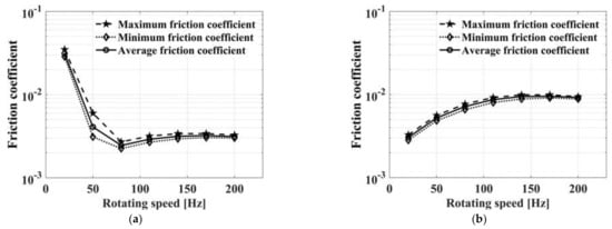 Using the proposed method, the friction coefficient according to the rotational speed was calculated. Figure 7 shows the simulated friction coefficients and the minimum film thickness of the UB and the LB. The contact between the shaft and the bearing only occurred at the UB because the gas force is applied to the upper part of the shaft close to upper bearing as shown in Figure 6. The simulated friction coefficient of the UB in Figure 7a shows that it increases quickly below the rotational speed of 80 Hz, with the smallest frictional coefficient when the solid contact begins to occur. The left region below 80 Hz can be regarded as mixed lubrication. In this region, there is contact in the UB because the bearing force is not sufficiently generated. The right region above 80 Hz can be regarded as hydrodynamic lubrication, and there is no solid contact in the bearing in that region. The minimum film thickness of the UB starts to decrease at a rotational speed above 140 Hz because the UBW near the bottom of the UB increased the centrifugal force. The LB is in the hydrodynamic lubrication regime with no solid contact. The simulated friction coefficient of the LB in Figure 7b shows that it increases with the increase of rotating speed below 110 Hz. However, in the operating conditions above 110 Hz, the increasing rate of the bearing force is almost proportional to the increasing rate of the friction force, which results in constant friction coefficients.