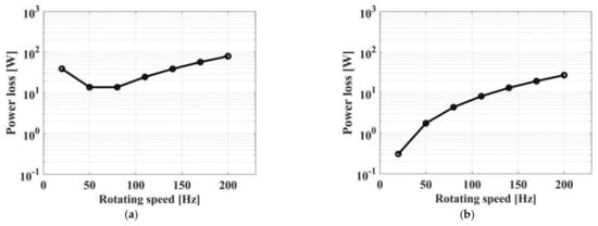 The power loss of the UB and LB according to the rotational speed were calculated in Figure 9. The power loss of the UB in Figure 9a decreases until 80 Hz and increases with the increase of rotating speed. It can be explained that there is no solid contact above 80 Hz and that hydrodynamic power loss increases with the increase of rotating speed. Meanwhile, the power loss of the LB in Figure 9b increases as the rotating speed increases because the LB is only operated by hydrodynamic lubrication.