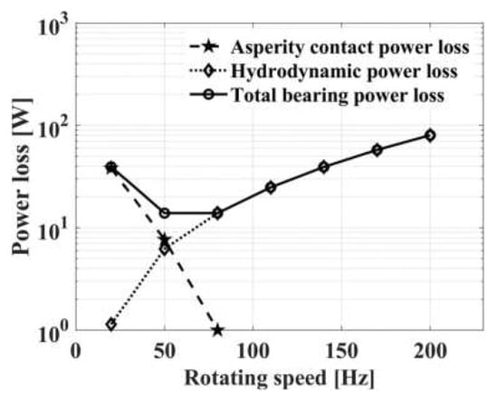 Figure 10 shows the total power loss in the bearing which is the summation of the asperity contact power loss and the hydrodynamic power loss. It shows that an asperity contact force exists below 80 Hz and it increases as the rotating speed decreases. In low rotating speeds, the hydrodynamic pressure is not sufficiently generated to balance the external forces, and the shaft contacts the bearing at the very small oil film thickness to generate asperity contact power loss. It also shows that hydrodynamic power loss only exists in the region above 80 Hz. It increases as the rotating speed increases.