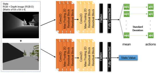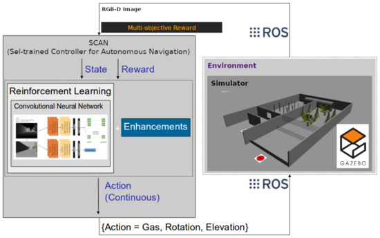 - Fourth, our algorithm is an end-to-end self-learning controller in which the RGB-D image is the input to the policy network, and three-dimensional continuous action (gas (moving forward), rotation (to left or right), and elevation) are the output of our algorithm;