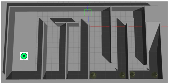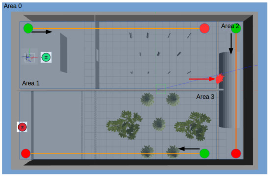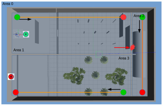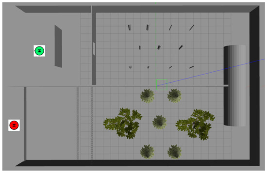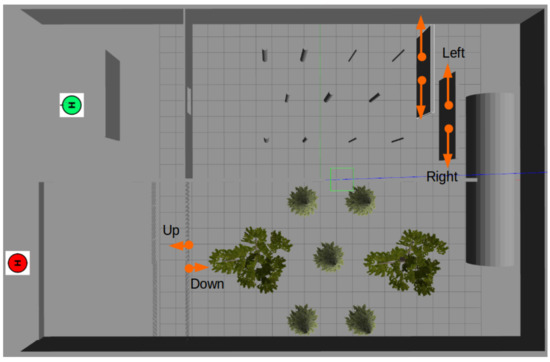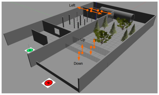 In this work, as it can be seen in Figure 5 and Figure 6, we defined a static environment, and as it can be seen in Figure 7 and Figure 8, we added two moving parts to the previous environments (two moving walls, and moving nets) to create a dynamic environment. Regarding the dynamic obstacles, that is, the walls and the nets, they move in one direction until they reach the other walls in case of walls, and the ground or max height (that is 3.0 m height) in case of nets. Further, we arranged them to move slightly slower than the moving speed of the UAV.