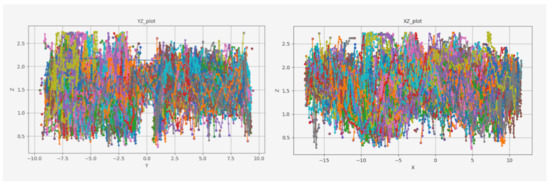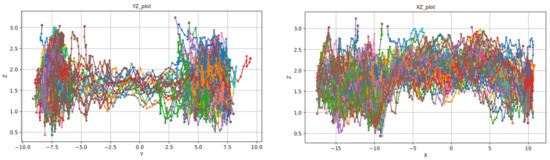 These diagrams illustrate the navigation of UAV using untrained SCAN in the challenging environment. The left image shows the trajetory of UAV navigation in the YZ plane. The right image shows the trajetory of UAV navigation in the XZ plane.