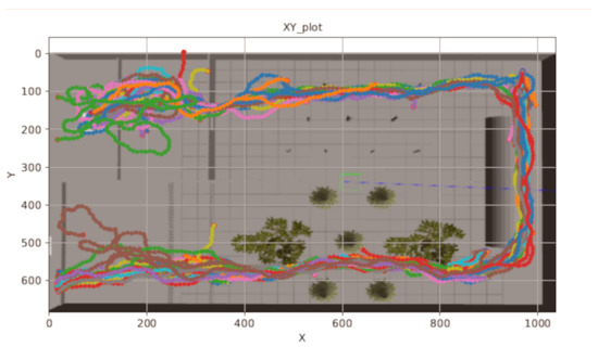 By looking at our navigation results in Figure 11, Figure 12 and Figure 13 (un-trained algorithm) and comparing it with Figure 14, Figure 15 and Figure 16 (trained algorithm), it is possible to see that our algorithm learns the shortest path for reaching to the goal position while avoiding the obstacles. The figure also shows the capability of our algorithm to control the UAV in the Z dimension. For example, the UAV is controlled to be at the height of about 1.5 m in the pipe area to pass through it. However, our algorithm increases and decreases the height of the UAV position several times in the area with several trees. Further, to pass the nets (while they are moving up and down), the UAV should be capable of optimal control over the Z dimension. Finally, the data in Table 1 shows the Success Rate of our trained algorithm, where Success Rate is equal to reaching to the goal location, starting from the beginning of the environment.