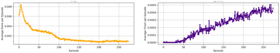 This figure shows the number of collisions and number of approaches to the goal position by the agent, where the agent is capable of decreasing the collision and increasing the reaching to the goal position by the time.