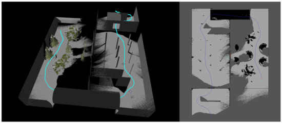 Visualization of the trajectory of UAV controlled by the SCAN algorithm (Area 1). The left image is 3D-SLAM and the right image is 2D SLAM.