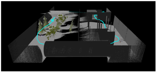 In order to clearly illustrate the trajectory of the UAV controlled by our proposed algorithm, considering the fact that our algorithm is controlling the quad-copter in 3-dimension, the best solution from our point of view was to use SLAM. We used SLAM since it can localize the agent in an environment and at the same time does the mapping, and as a result, we can see the trajectory of the agent movement in the environment. As one can see, the images generated by the SLAM we used in this paper are focused on localization and not on mapping. In other words, the mapping result seen in our SLAM images in this paper are the result of moving through the shown trajectory from the starting point of that trajectory to the ending point of the trajectory; that is, we did not focus on the mapping part to generate a perfect map. Finally, here we again emphasize that the SLAM only is used for visualization purposes, and the result of the SLAM algorithm is not used in any way in the training, playing, and control of our algorithm and the agent shown in this paper. We used a SLAM package called RTAB-Map [30] and set it to use the RGB-D image and odometry data coming from the simulated agent in the Gazebo sim. to generate the mapping and localization information.