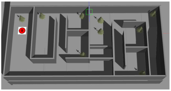 The second unknown environment consists of many rooms and trees, and also it comprises two floors, where the only way to move to the second environment is through the staircase at the end of the first floor (Figure 27 and Figure 28). Considering the trajectory illustrated in Figure 29, Figure 30, Figure 31, Figure 32 and Figure 33, related to the unknown environment, the UAV visits one of the rooms on the first floor, then returns to the starting location, and then continues moving through the corridors to the staircase, climbs the staircase, and moves through the corridors, passes through the trees, passes a similar obstacle to the nets, and flies to the target location. To explain the behavior of the UAV in the unknown environment, we believe the model trained in the static and dynamic challenging environment learned a couple of things. It learned to pass through the window and pipe, and perhaps this best explains why the UAV prefers to move through the corridors where they have a similar depth image. Further, it learned to ascend and descend when it wanted to pass the static and dynamic nets, which explains why it is easy for it to climb the staircase. Perhaps one question could be why the UAV chooses to go to the first room on the first floor instead of choosing the corridor, which we believe is due to the Gaussian noises we used to generate the final actions, where it gives a kind of random sense to the controller-generated actions.