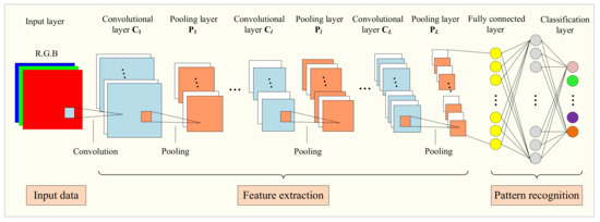 A classical CNN architecture usually consists of three parts: convolutional layers, pooling layers, and a fully connected layer, as shown in Figure 1. A convolutional layer usually contains a set of convolution kernels and one trainable bias per feature map. After the convolutional layer, a pooling layer is usually added between the convolutional layers to merge the outputs of the previous convolutional layer into a single neuron. The feature maps from the last pooling layer will be connected to a fully connected structure after being concatenated into a one-dimensional vector. The fully connected structure may contain one or more hidden layers. A SoftMax layer is usually posted as the output layer to realize the classification tasks by mapping the values of the fully connected layer into a probability distribution that ranges from 0 to 1. Detailed information about convolutional neural networks can be found in [16,18].